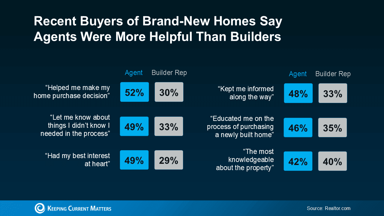 Data shows that buyers generally rate their real estate agents higher than their builders when reflecting on their new home purchase. This may be because agents are advocates for their clients, ensuring their interests are represented throughout the buying process. As Realtor.com notes: